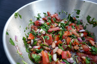 Prep Time: 5 mins Serves: 4 Skill Level: Beginner Just in time for summer, this colourful salsa is fresh and rich in flavour. An excellent sweet and spicy addition to any BBQ, meze, Mexican mash up, Indian or even a middle eastern spread. Load on to salads, spuds (Paprika Roasted Sweet Potatoes pictured below), wraps, Buddha bowls etc etc. To be honest, there's not much I wouldn't pair this salsa with.